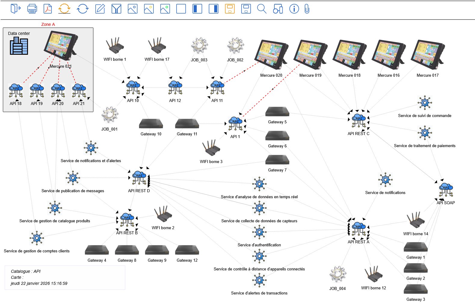 Cette plateforme, très générique, est basée sur le principe de la décomposition d’un système en objets tels que les processus métiers, les domaines, quartiers et bloc fonctionnels, les applications, les interfaces, les serveurs, les VM, les données, les traitements des données, les caméras IP de surveillance etc. La donnée est également un objet essentiel car elle représente la richesse du SI et de l’entreprise.